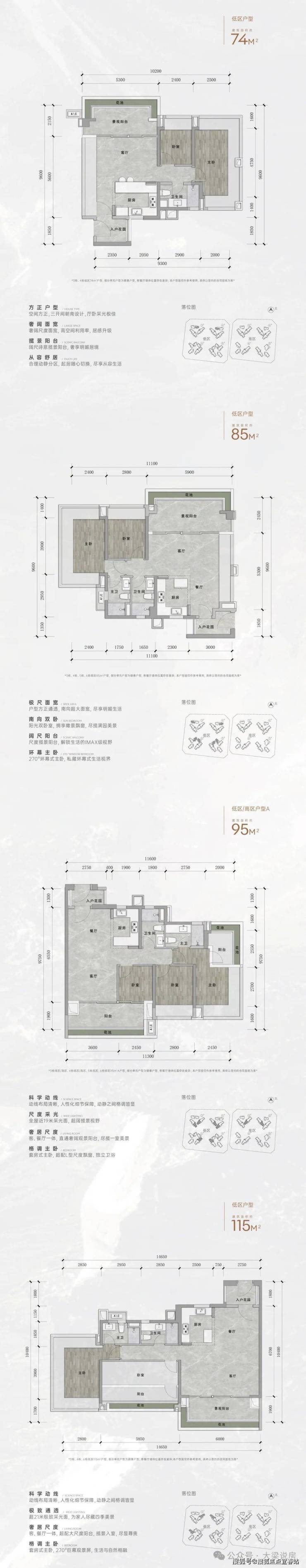 4到29层为低区,2梯6户,户型有建面约74-85-96-115-129㎡等面积段;