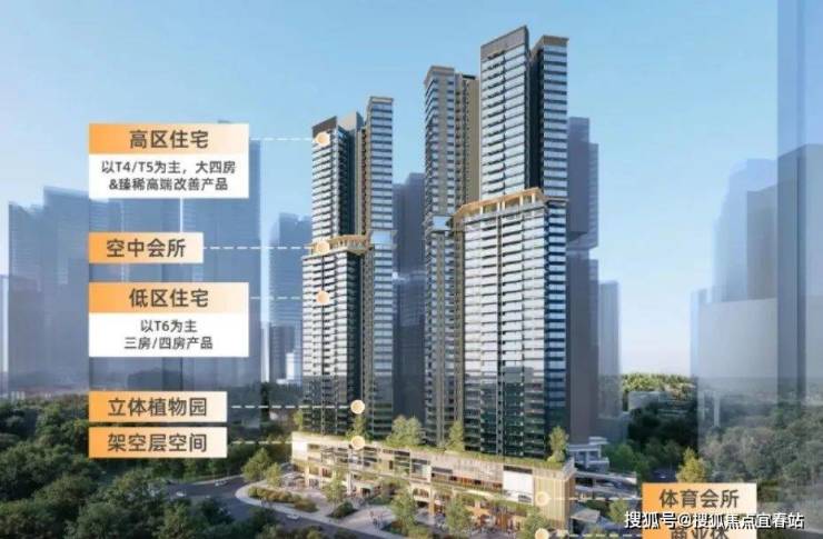 项目整体的布局还做了分区,,1到3层是商业街区、体育综合体、空中园林等,4栋住宅楼共用,4层及以上才是住宅。以首推的3#为例,共44层高,其中: