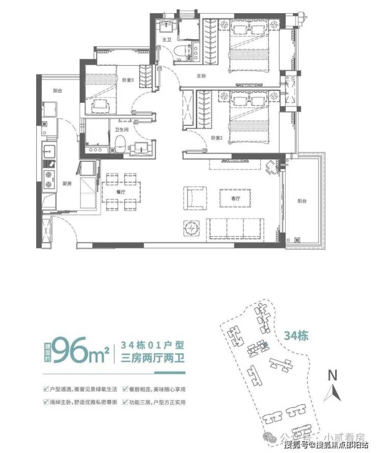建面约96㎡滨水舒适三房,餐客厅一体化,连通观景阳台,臻藏生活美景,客厅与休息区以科学合理的布局分隔,动静皆从容,卧室均规划大面宽飘窗,放大房间尺度感,营造舒适生活体验。