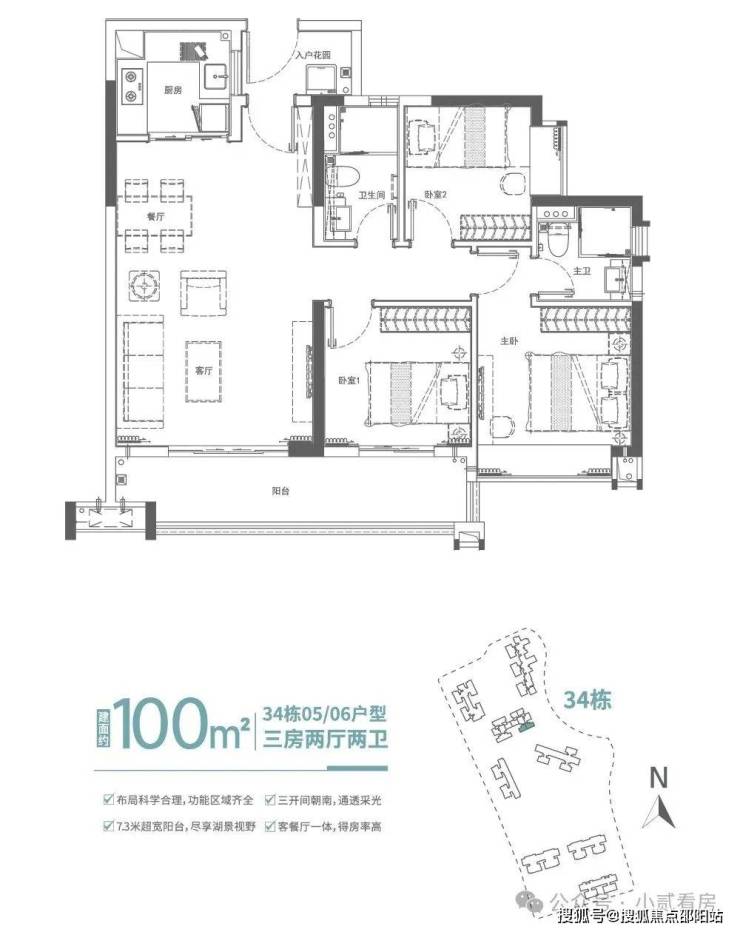 建面约100㎡瞰景大三房,约7.3米超宽阳台,以宽阔的光照面,大幅度迎入阳光,湖园美景尽收眼底。而南向主卧,尊享独立明卫,以超大观景飘窗,自成一方私密天地 ,每天惬意享受清风与阳光。