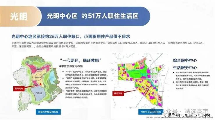 2020年6月9日深圳市规划和自然资源局发布《光明科学城规划刚要》中,规划“一心两区,绿环萦绕”的科学城总体空间布局,以光明中心区为依托,建设科学城的生活服务中心。 (资料来源:深圳市政府在线)