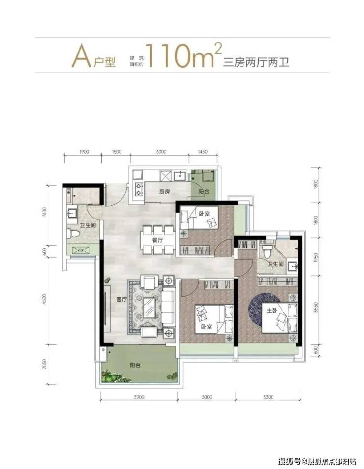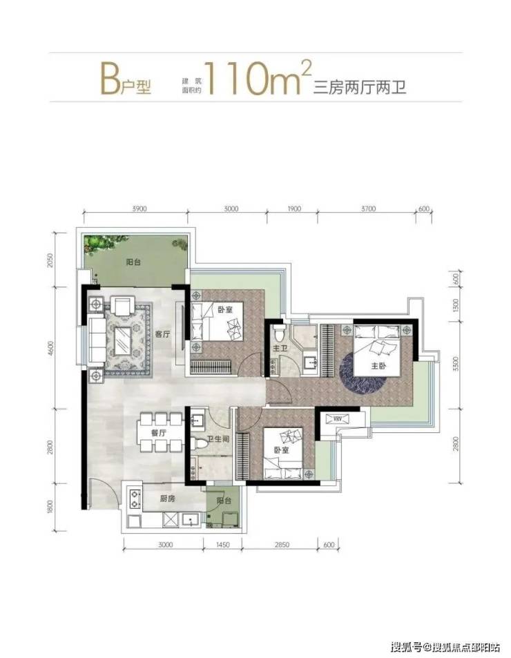 - 布局:竖厅设计,LDKB(客餐厨阳)一体化,客厅开间3.9米,主卧3.3米宽带飘窗,次卧3.1米。
