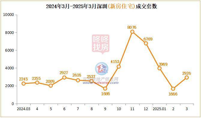 统计数据显示:2025年3月深圳成交2926套新房住宅,环比增加75.6%;成交面积300042平方米,环比增加76.4%。
