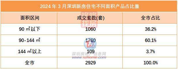 2025年3月深圳成交2929套新房住宅,其中90㎡以下的产品成交1060套,占全市总量的36.2%;90-144㎡改善型产品成交1760套,占全市总量的60.1%;144㎡以上的产品成交109套,占全市总量的3.7%。