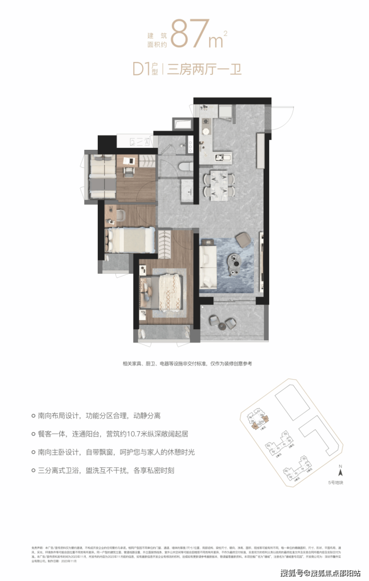 “10.7 m纵深紧凑南向三房”,10.7 m纵深餐客一体,通风采光极佳