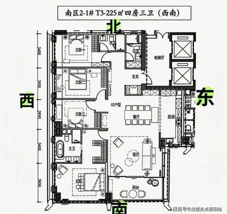 2.约225㎡四房三卫:位于楼栋西南,主阳台正南看园林,侧东南看公园。四房双套设计,卧室朝西,采光充足。