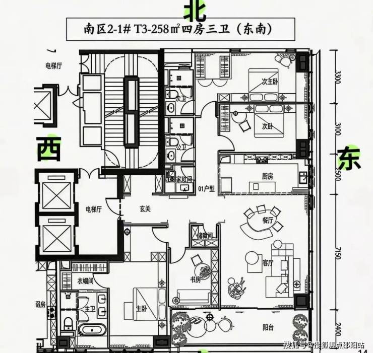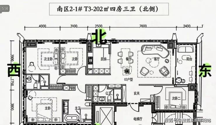 约202㎡四房三卫:位于楼栋北向,三面采光,四房双套设计。主阳台朝东,大面朝北,格局方正