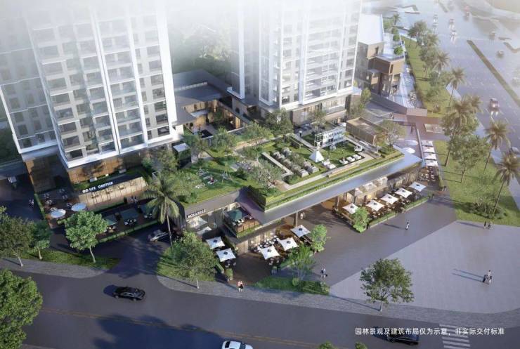 【抬高式檐上浮岛花园露台】:约1000㎡,位于商业街区顶层,业主私享花园露台,提供丰富空间活动区域,是邻里交流娱乐的理想场所。