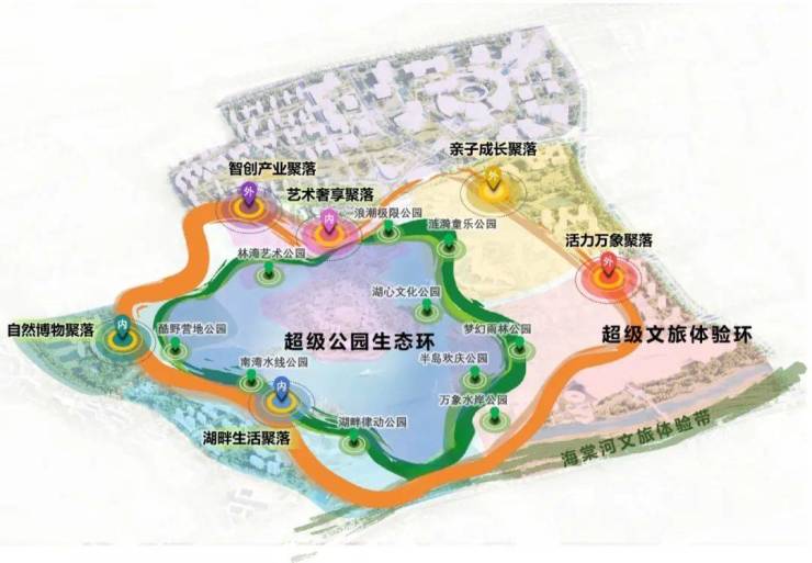 未来,经过水系生态的基础打造后,图层的底色成为「可持续」的绿色、蓝色,覆盖和串联的节点是10个特色公园,不仅自然风光旖旎还搭配世界级设施,涵盖IP、展示、露营、高阶水上运动、疗愈等特色功能。并且,按照南北分区规划的原则,初步实现了「北动南静」的布局。