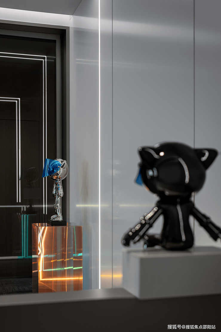 向着光去思考,描绘着让人充满想象的未来图景,总经理办公室以冷静的蓝色块面和富有未来感的金属线性几何墙面收纳,围合出独立沉静的办公空间。