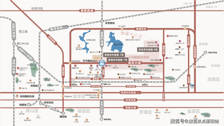 地铁时代,内通外联:东莞地铁R1线环市路站、湖景路站(规划中),与深圳22号线地铁线接驳,3站到观澜,通达福田。