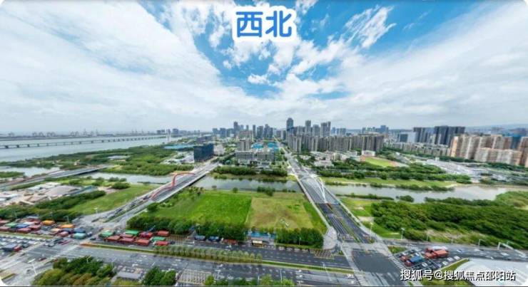 东北:楼下近距是公园绿地和双界河东段景观,远处看新安老城方向,整体远景城市景观为主。