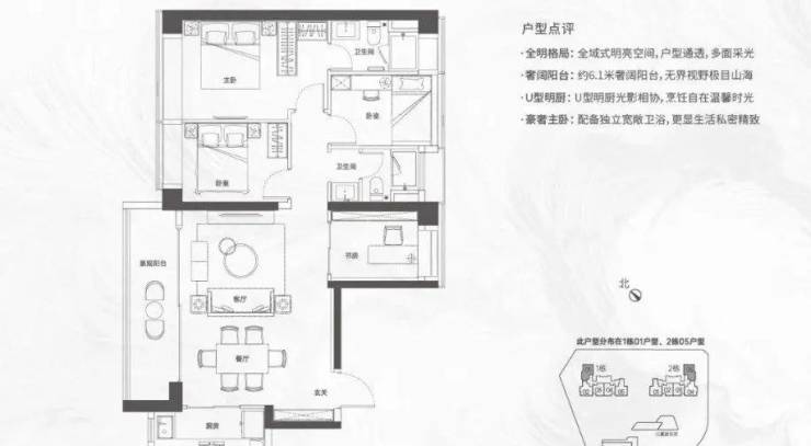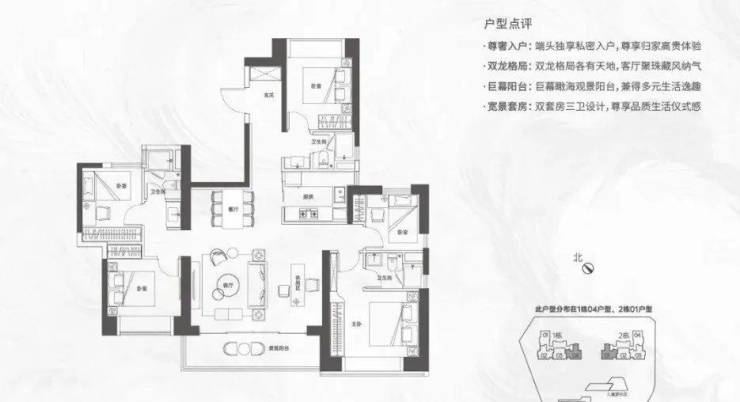 167㎡5+1房三卫:同样位于32-43F高区,户数不多,南向看海,功能配置上完全满足家庭需求。