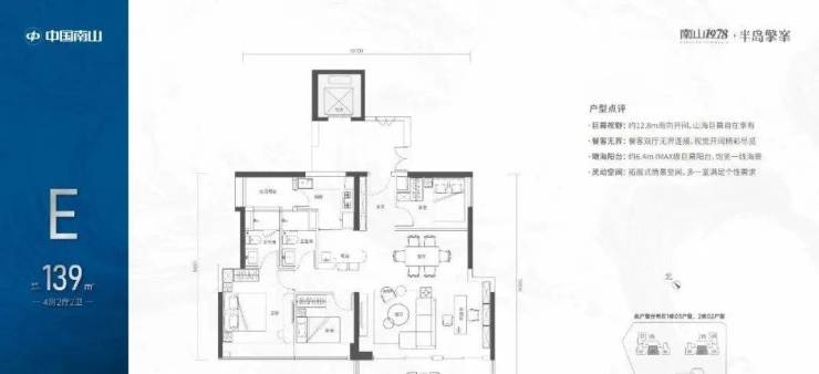 139㎡四房二卫:位于32-43F高区,户数非常少,南向看海,独立电梯厅面积达到20㎡。