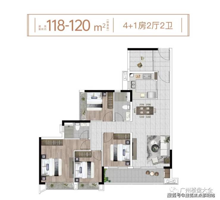 楼盘还在售建面约118-120㎡、约122-126㎡ 4+1户型,部分带双套房,适合三孩家庭。