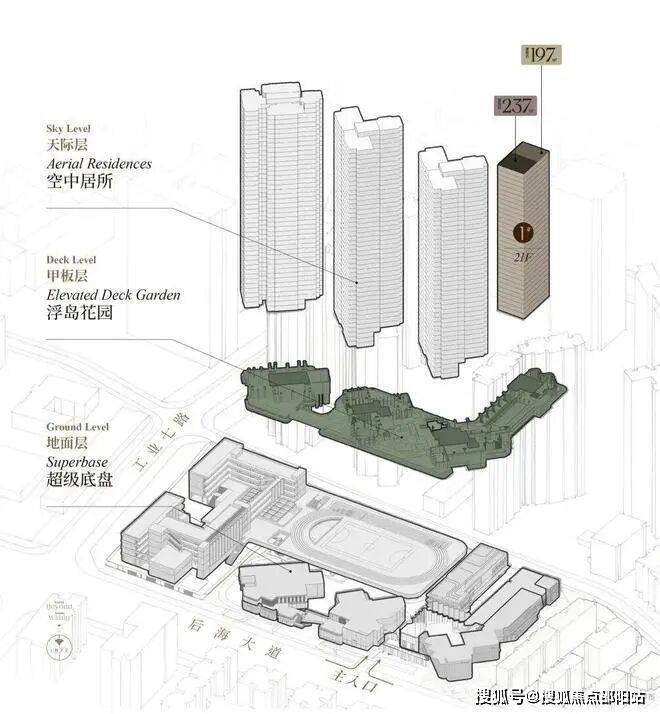集合多家大师级机构的智慧,以浮岛甲板的设计手法,打造功能复合的“超级底盘”,将整个社区抬高12米,构筑出两个能量完全不同的“场域”。
