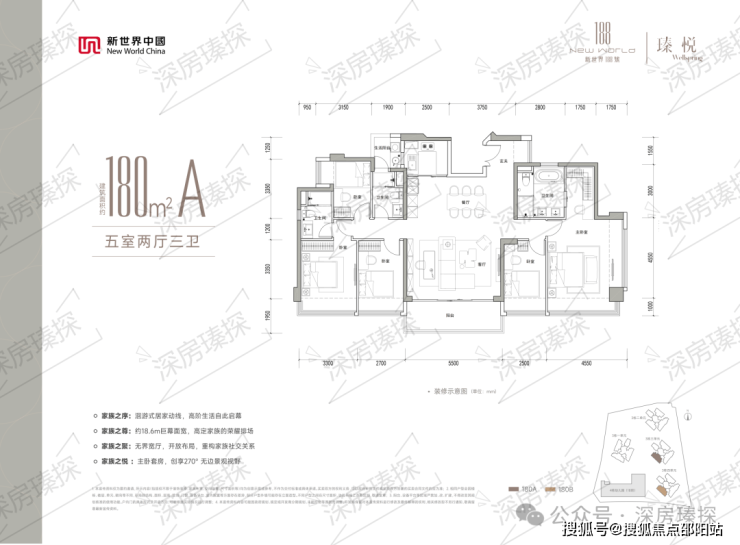 180㎡的5房2厅3卫,设计的是竖厅双龙抱珠格局,客厅5.5米开间,LDKB一体化设计,五开间朝南,约18.6米巨幕面宽,双主卧套间,分别做到了主卧30.5㎡/次卧15.45㎡/次卧11.75㎡/次卧10.87㎡/次卧8.5㎡(包含墙体飘窗),U型厨房,公卫带1个生活阳台约3.89平,阳台约10.73㎡西南朝向。