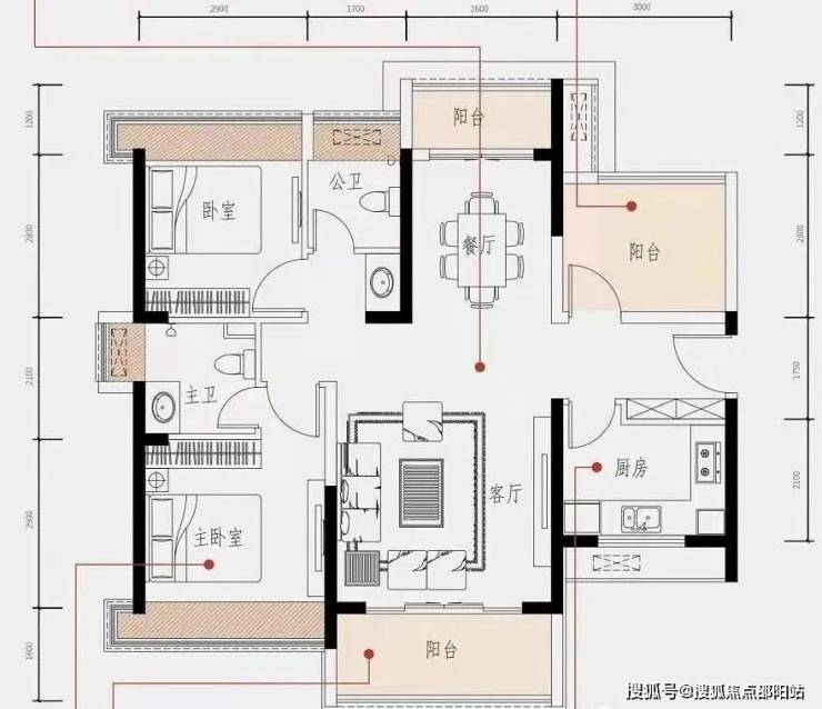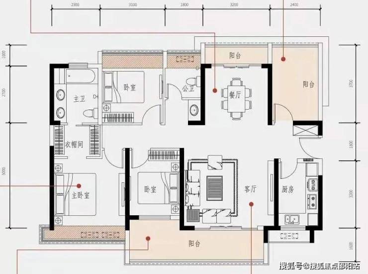 A户型:约117㎡ 4房2厅2卫 亮点:餐客厅双阳台 奢阔主卧