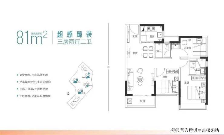 81㎡的3房2厅2卫,设计的是竖厅格局,餐客厅一体化,动静分区,客厅3.2米开间,3个卧室分别做到了主卧13.3㎡/次卧7.83㎡/次卧6.9㎡(包含墙体飘窗),U型厨房,公卫三段式分离设计,得房率78.19%(不含赠送),阳台进深1.25米,有东南、正南或东北向。