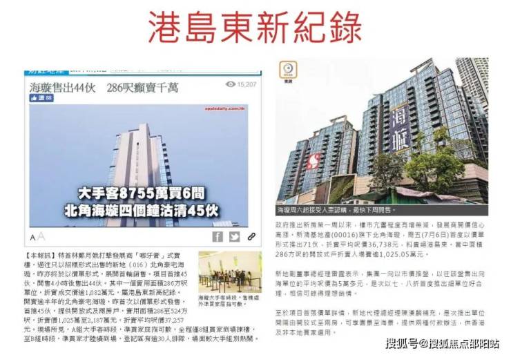 豪宅新盘承接力持续。新鸿基地产北角临海现楼项目海璇II再录成交,第3座16楼B室,3房实用面积1155方呎,连车位成交价4538万元,实用呎价39290元,创项目今期暂沽单位新高纪录。买家选用720日成交期付款,享提前入住优惠。该盘本月暂已录得7宗成交,套现约3.27亿元。