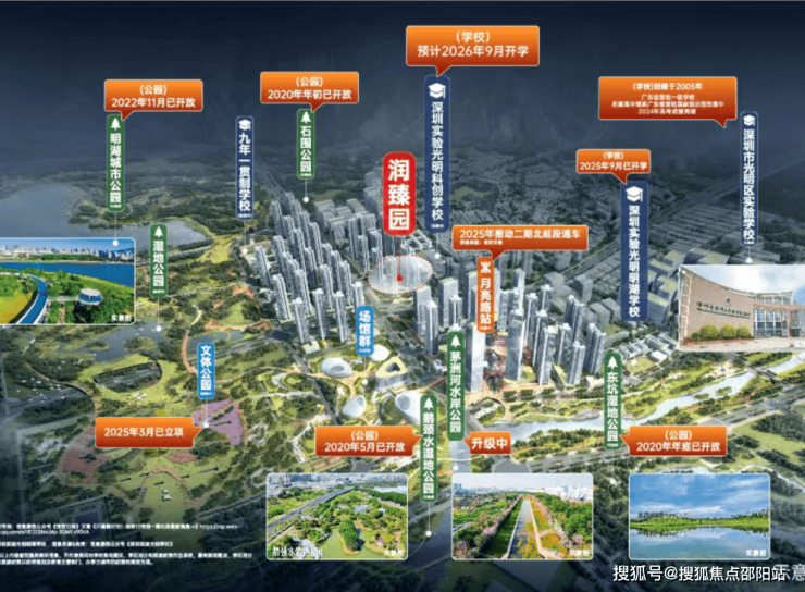 <教育>:社区内配置幼儿园。大城规划3所九年一贯制学校、其中一期学校深圳实验光明明湖学校2025年9月已开学(信息源自深圳光明学校公众号);