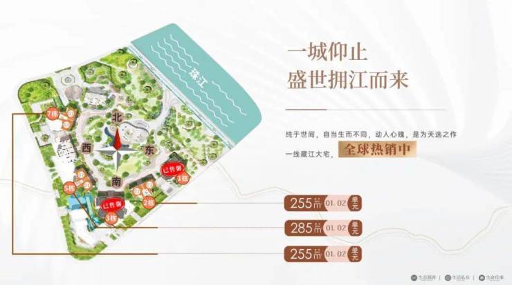 户型:建面约233-285㎡四至五房,东向/东南向一线望江,极致3.4-3.6m层高
