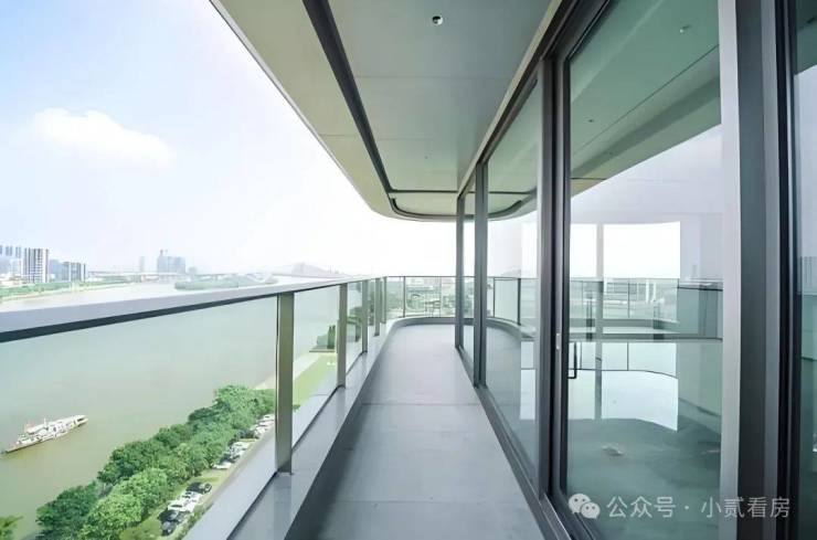 更震撼的体验,是当你步入阳台时。弧形玻璃的设计,让江景全画幅被你的视觉所占有,带来极强的视觉冲击力。驻足于此,你不需要去眺望江景,而是开阔的珠江直接将你环抱。