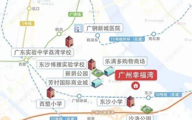 项目目前现有地铁是1号线西塱站距离项目大约3.5公里,周边还有10、11、22号线(在建中)三地铁交汇,其中距离10号线东沙站仅约600米(预计2024年底开通),串联天河白云越秀荔湾和海珠区,连接广州火车站、广州东站等大型交通枢纽,便捷出行;