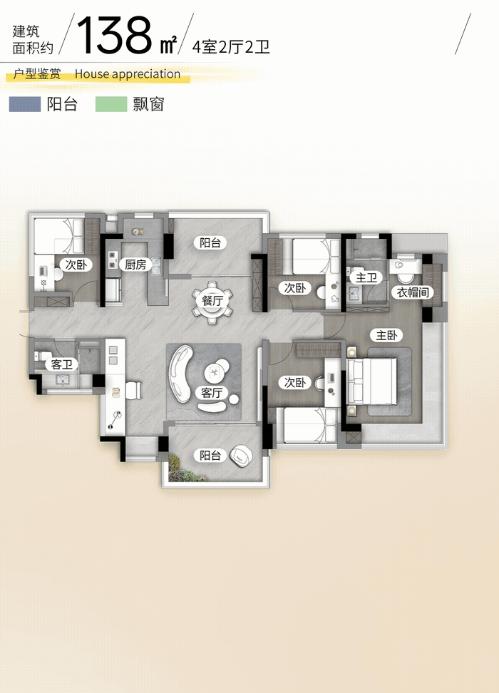 主卧270°无柱转角全景舱,含墙含飘窗18.3㎡