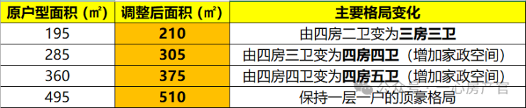 户型升级:此为最大变化之一。户型面积段普遍扩大约15-20㎡,并优化了内部结构,主要特点是卫生间数量增加,具体调整为: