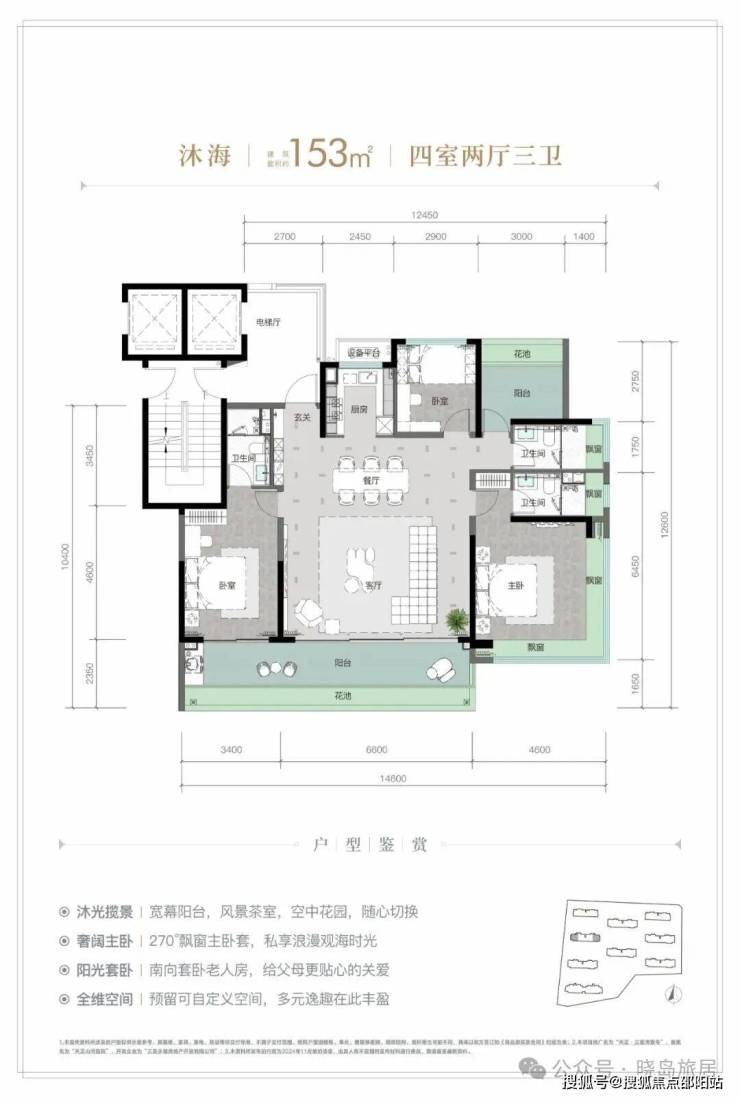 规划建面约 126-213㎡观海奢装大平层,以约 3.1 米阔尺层高拓宽空间尺度;部分户型创新打造 270° 全景飘窗主卧套、四开间朝南等设计亮点,全系高标奢装成品交付,重新定义高端舒居范式。
