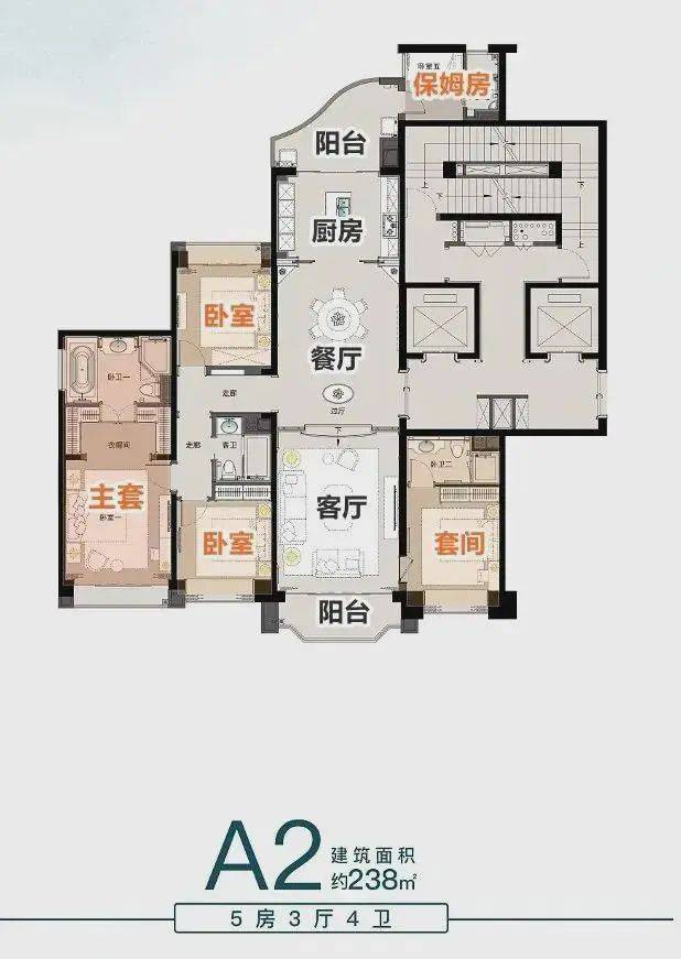 建面约238㎡五房三厅四卫设计,餐客厅厨阳台于一体,南北大对流,形成了阔绰的空间结构。