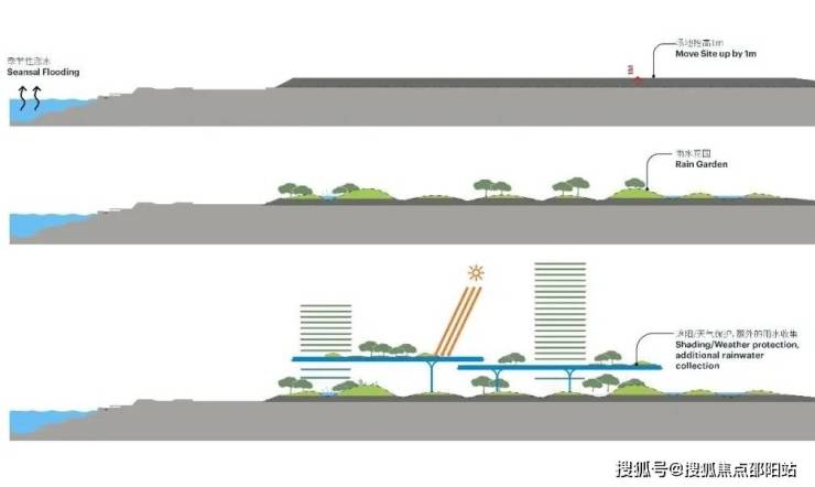 将地面空间开放给行人、绿植,不仅能美化环境,还能很好的应对气候环境所带来的洪涝挑战。(如上图)