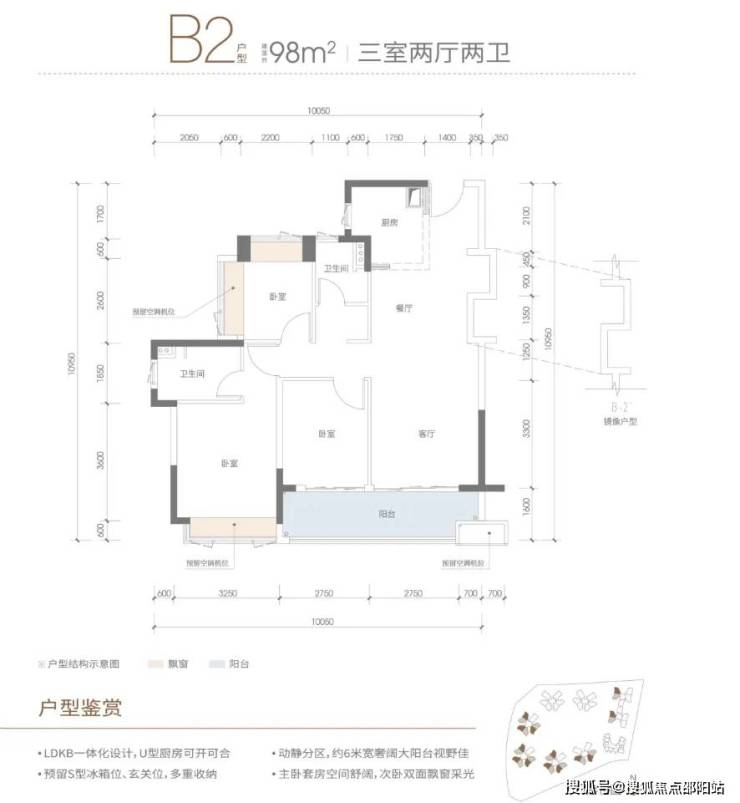 ①:B2-98㎡三房户型是传统竖厅动静分区,结构没什么硬伤,在这个面积段和功能间配比来说空间感也一般,宽体阳台是比较明显的一个卖点。