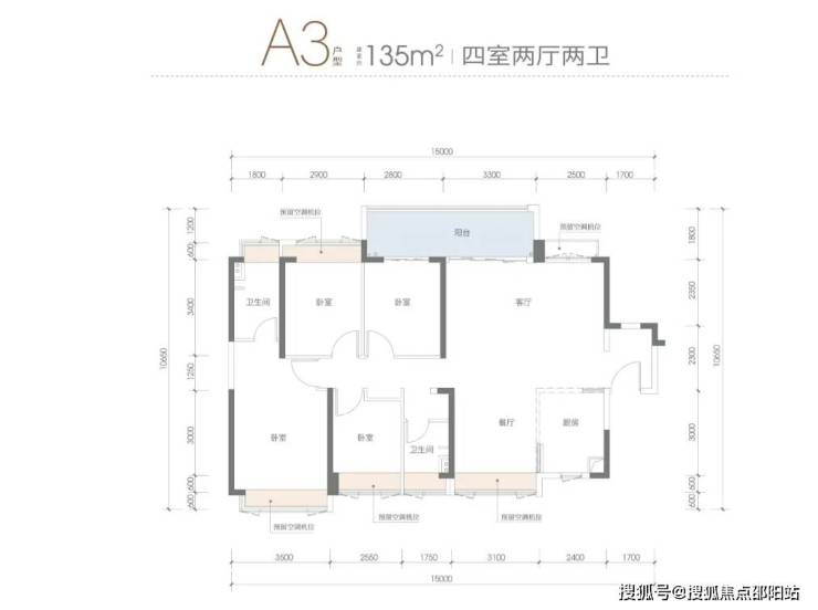 ②:A2-132㎡四房户型是改善户型中比较常见的横厅+宽体阳台,除了横厅无可避免的静逸性没那么好外,结构整体无明显槽点,6.1米大面宽阳台+通透主卧是突出卖点。