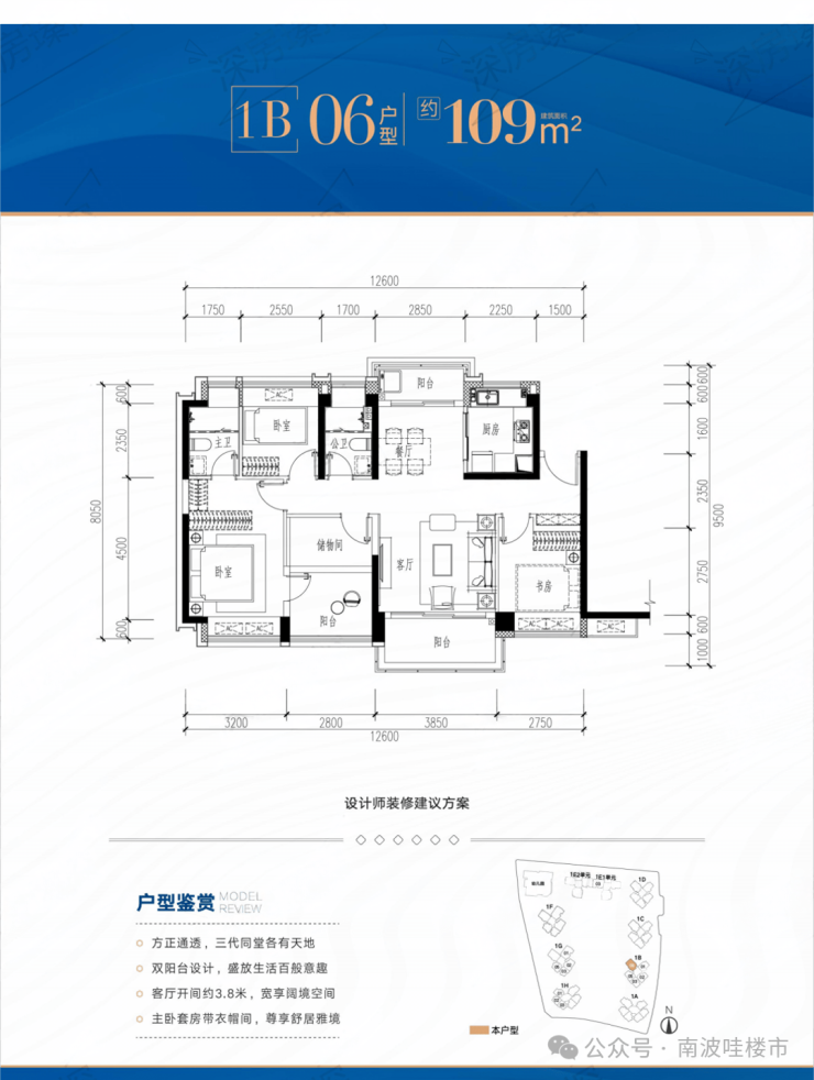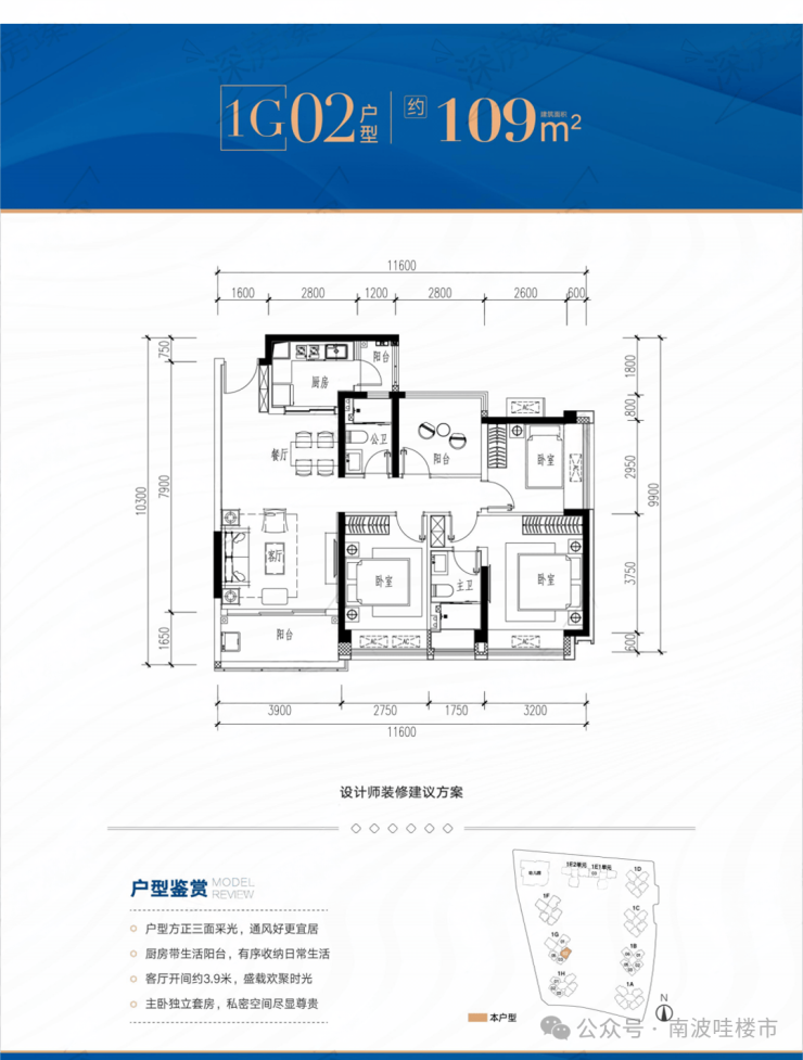 109平4房2卫,竖厅格局,南北通透/东南朝向,赠送面积14.41-16.43㎡,加赠送后得房率约92.82-94.67%。