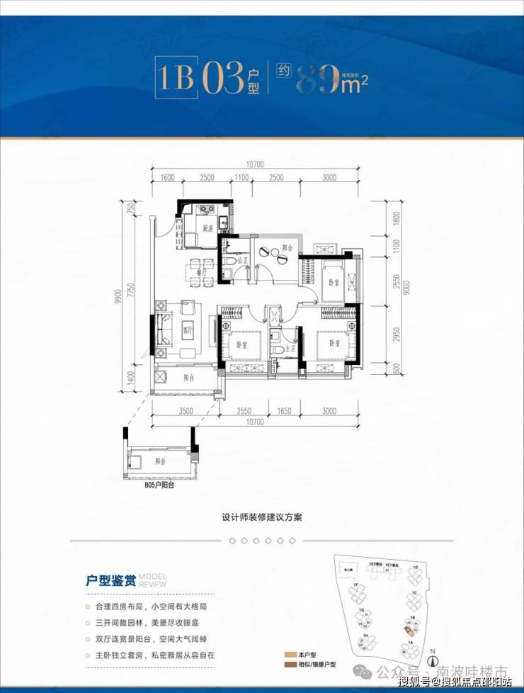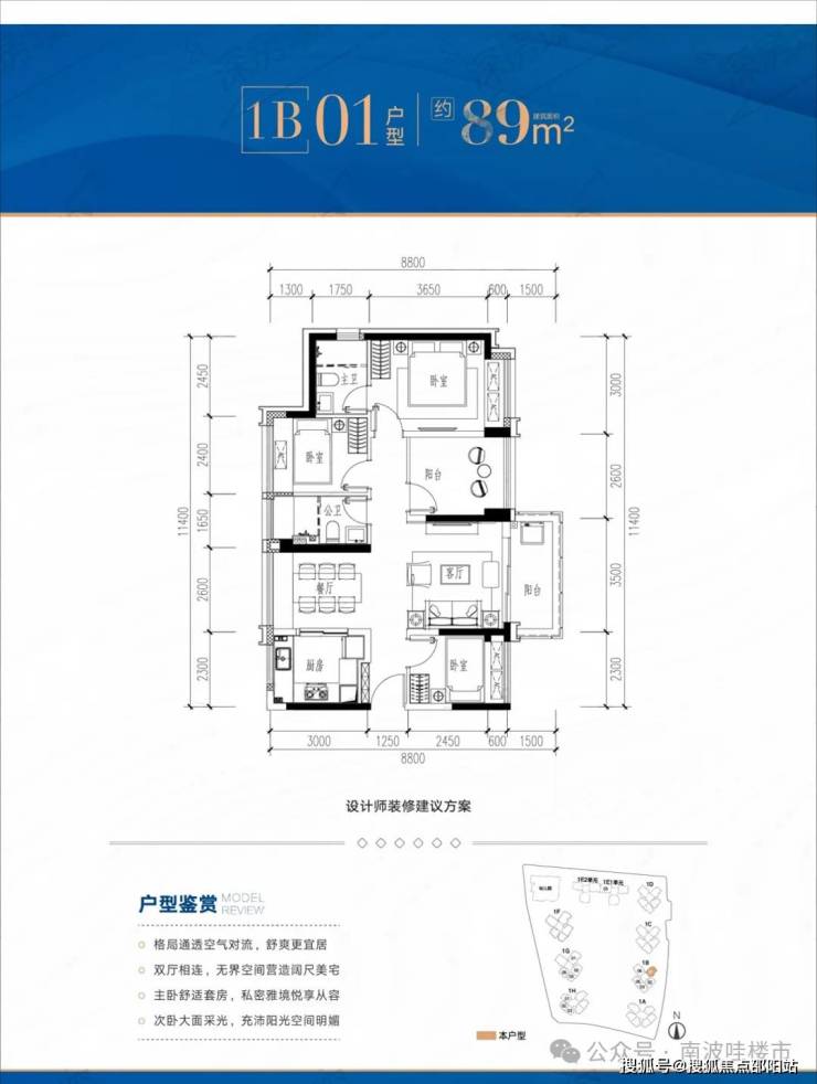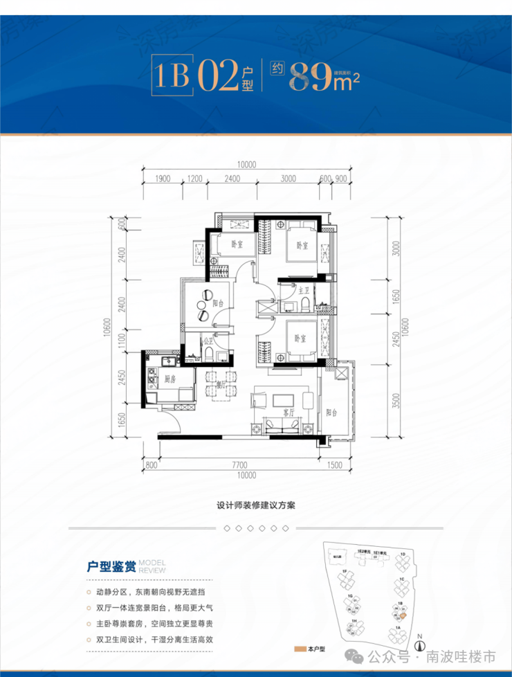89平4房2卫,竖厅格局,赠送面积约11.85-15.02㎡,加赠送后得房率约93-96.48%。