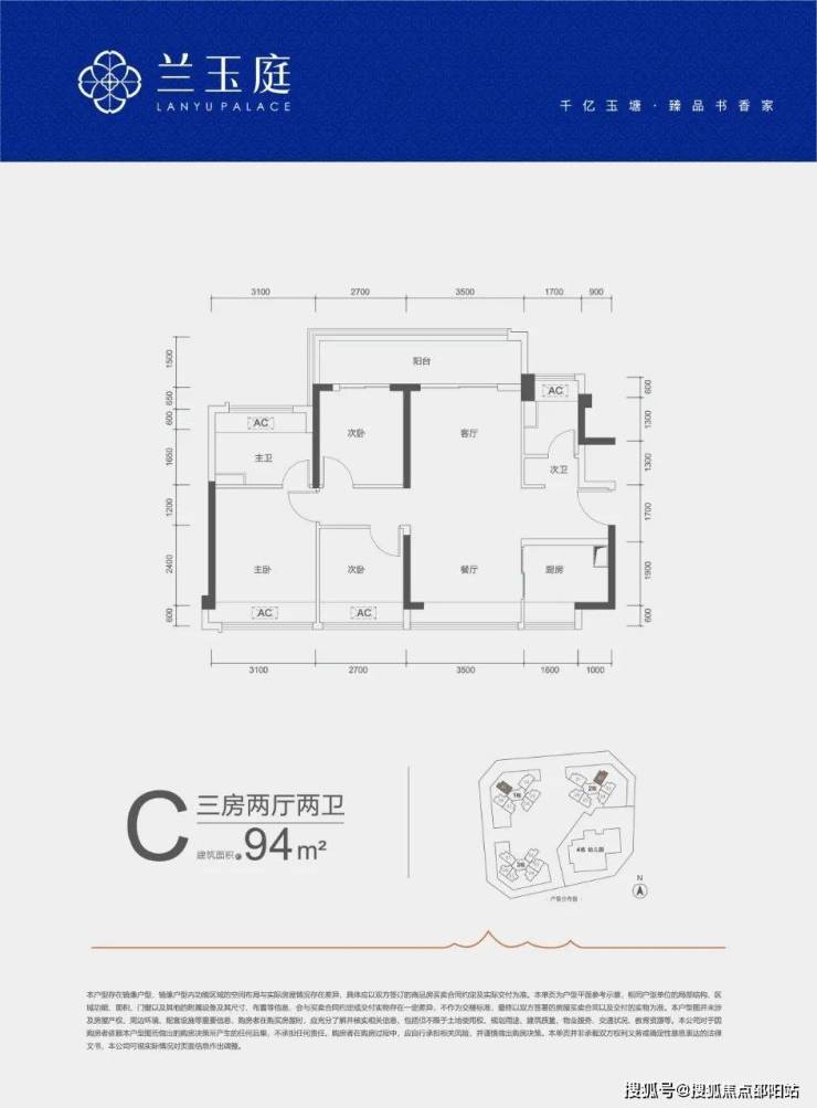 94㎡的3房2厅2卫,C户型,设计的是竖厅南北通透格局,客厅开间3.5米,3个卧室分别做到了3.1米/2.7米/2.7米的宽度,客厅连接次卧出6.2米长的大阳台,U型厨房,公卫三段式分离,得房率约79%(不含赠送),阳台主朝西北或东北向。