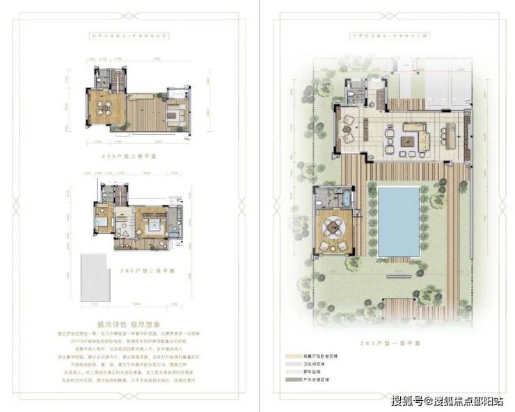 户型设计堪称“空间艺术的极致表达”:建面约109㎡合院打造约300%使用率,约3.3米层高、三面采光、三层空间配备3间全套卧室,每层衔接户外庭院或露台,实现室内外无界延伸;建面约130-260㎡合院则引入主附楼结构、前后双庭院、温泉入户、私家泳池甚至高尔夫练习场,部分户型更设270°观景露台与双主套配置,重塑滨海墅居奢华尺度。