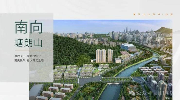 南向,是郁郁葱葱的塘朗山,近1000万平的原生山脉,森林覆盖率达约87%,山高谷深、林茂水长。60%绿化控规,全市第一的天然氧吧,负氧离子含量2万/cm³,是福田中心区的4倍