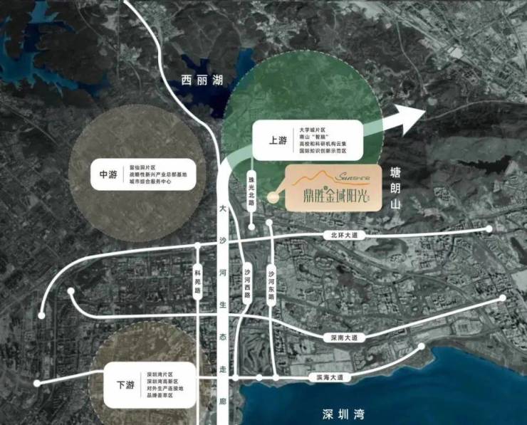 宅藏乾坤,乘山御水:项目南依塘朗山,北面西丽湖,西临大沙河,推窗观山,临街瞰河,不仅营造了豪宅级居住体验,更是南山绝佳风水之地。