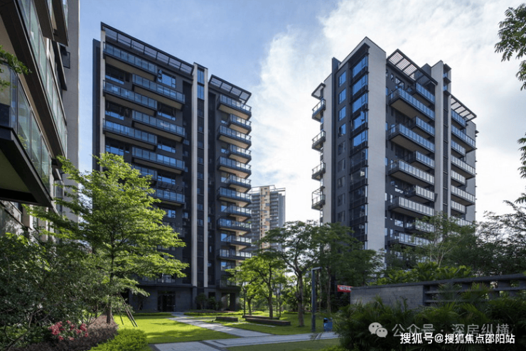 香山美墅的高层、小高层立面延续了现代中式风格,色彩以黑白灰为主调,作为组团空间的外围界面,围而不合,线条干净利落,用材简洁现代,与原有的纯水岸、侨城馨苑等现代风格高层进行了很好的对话。户型设计通透,采用大面宽小进深,立面形成大面积的出挑阳台,侨城景色一览无余,而向中式院落的回望,也完成了对院落精神内核的追慕和升华。