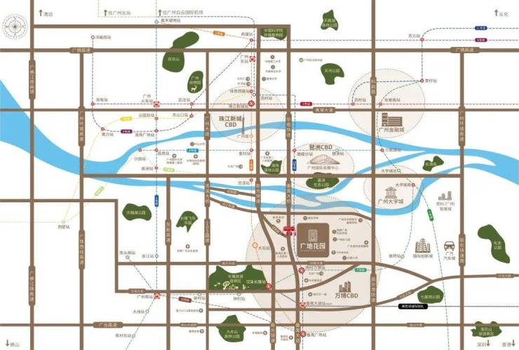 广地花园地处华快入口,自驾十分钟到琶洲新洲站,十五分钟到珠江新城。还有自己的楼巴车直达琶洲-客村。天河黄埔大道线的 暨大南门-天河南二路-体育中心。中山大道线:华师南门-天河南二路-体育中心。越秀区 动物园南门-华泰宾馆-建设六马路。门口公交系统完善,有通往广州各区的公交车。