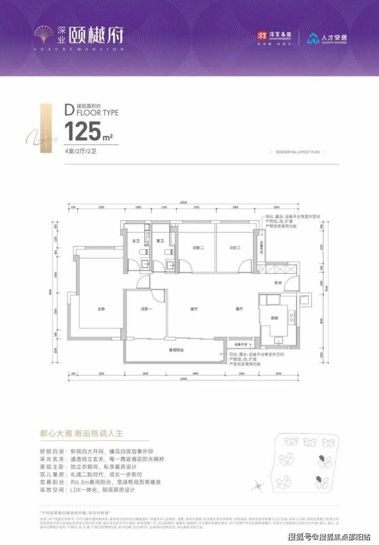 125㎡的4房2厅2卫,设计的是横厅南北通透格局,进门入户玄关,客餐厅6.3米开间,客厅连接次卧出6.8米长的大阳台,主卧南北通透设计,4个卧室分别做到了3.2米/2.8米/2.7米/2.6米的宽度,U型厨房,卫生间干湿分离,得房率:80.85%(不含赠送),阳台主朝西南向。