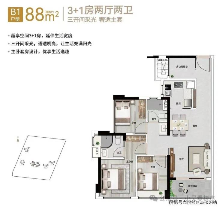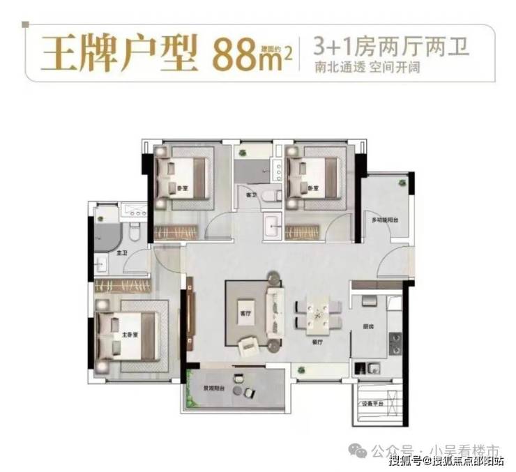 建面88平横厅3+1房,四开间朝南,南北对流,约11米的南向采光面,客厅面积达到20平,L型厨房,客餐厅一体化,总价370-400万左右。