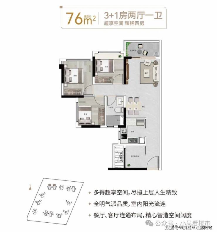 建面76平3+1房,该户型直面自然山体,窗外山景尽收眼底,全明采光设计也保证了室内的通透性,主卧、次卧、卫生间、厨房、客餐厅,每个重要的生活区域都能随时拥抱阳光与清风,总价310-330万左右。