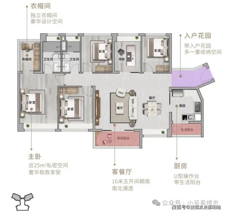 建面119平4+1房,有横厅有竖厅,都实现了餐客厅一体化,主卧带衣帽间套房设计,空间感媲美140平,总价600-720万左右。