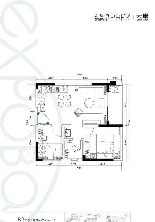 【B2户型:63㎡】房型:两房一厅一卫朝向:E1、E2(西南、东南)户型优势:端头位、双面采光、无敌景观