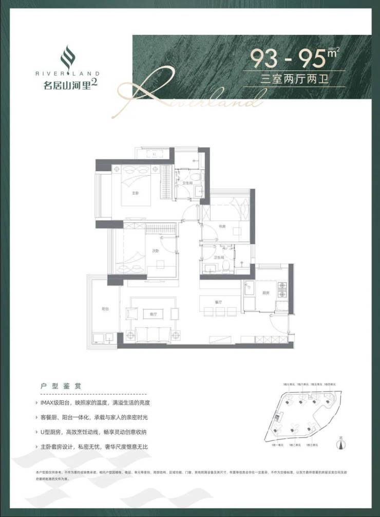 93-95㎡的3房2厅2卫(03户型),设计的是经典竖厅格局,餐客厅一体化,客厅3.5米开间,三开间朝南,U型厨房,得房率:74.83%(不含赠送),阳台1.5米进深,西南朝向。