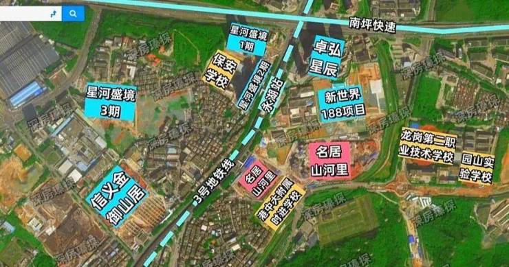 名居山河里,位于龙岗区园山街道3号地铁线永湖站东南侧150米,地处龙岗黄金三角地带,北邻大运新城,东侧是阿波罗未来产业城,西南侧是横岗中心片区。